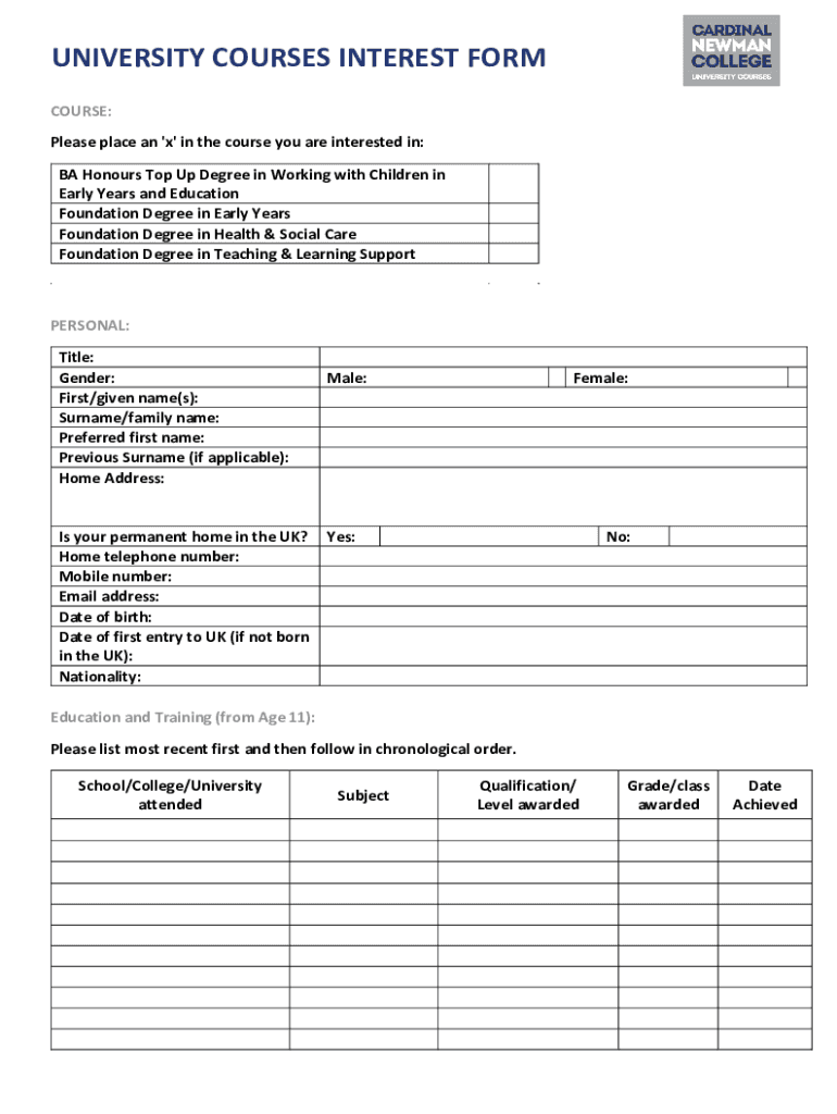 UNIVERSITY COURSES INTEREST FORM COURSE: Please place an 'x in the course you are interested in: BA Honors Top Up Degree in Working with Children in Early Years and Education Foundation Degree in