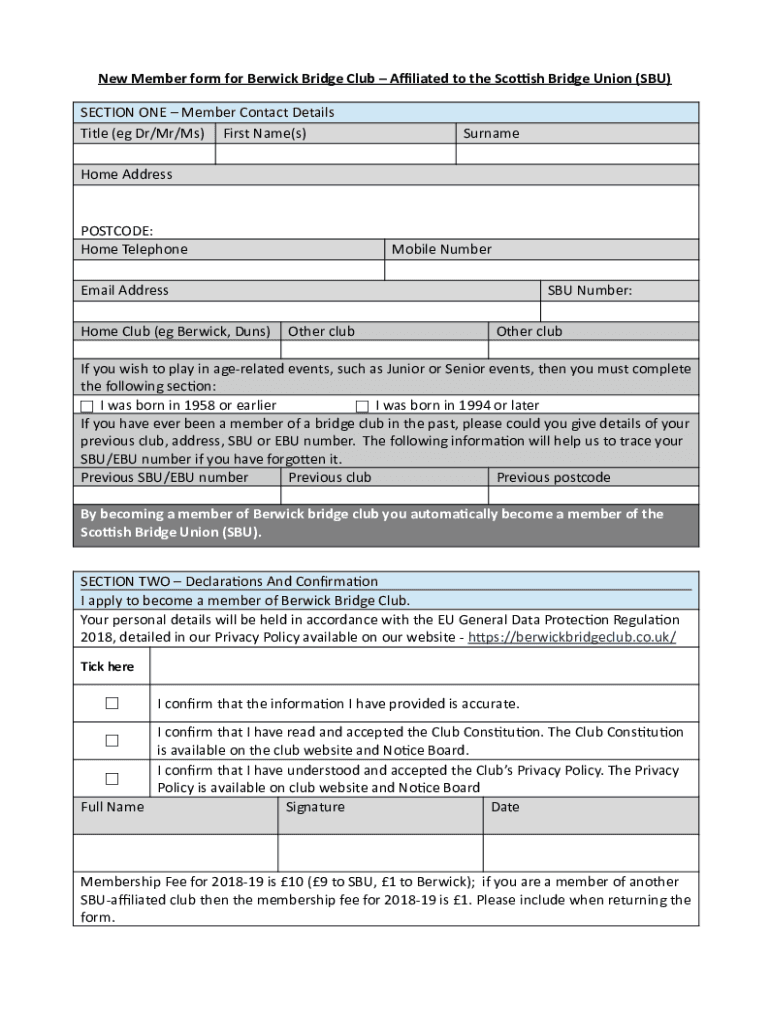 New Member form for Berwick Bridge Club Affiliated to the Scottish Bridge Union (SBS) SECTION ONE Member Contact Details Title (e.g. Dr/Mr/Ms) First Name(s)SurnameHome AddressPOSTCODE: Home Telephone
