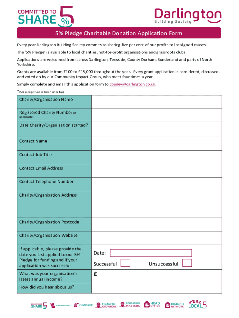 5% Pledge Charitable Donation Application Form Every year Darlington Building Society commits to sharing five per cent of our profits to local good causes. The 5% Pledge is available to local charities,