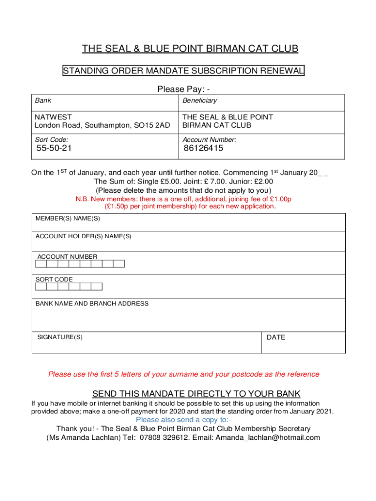 THE SEAL & BLUE POINT AIRMAN CAT CLUB STANDING ORDER MANDATE SUBSCRIPTION RENEWAL Please Pay: BankBeneficiaryNATWEST London Road, Southampton, SO15 2ADTHE SEAL & BLUE POINT AIRMAN CAT Clubfoot Code:Account
