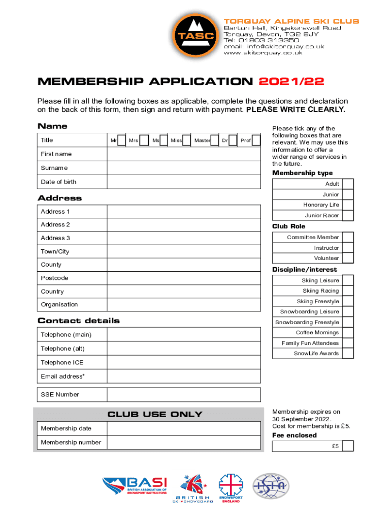 MEMBERSHIP APPLICATION 2021/22 Please fill in all the following boxes as applicable, complete the questions and declaration on the back of this form, then sign and return with payment. PLEASE WRITE