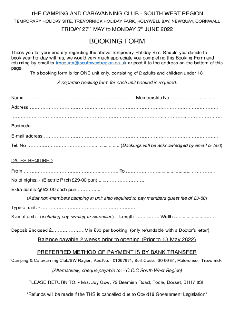 THE CAMPING AND CARAVANNING CLUB SOUTH WEST REGION TEMPORARY HOLIDAY SITE, TREVORNICK HOLIDAY PARK, HOWELL BAY, NEWBURY, CORNWALLFRIDAY 27th MAY to MONDAY 5th JUNE 2022BOOKING FORM Thank you for your