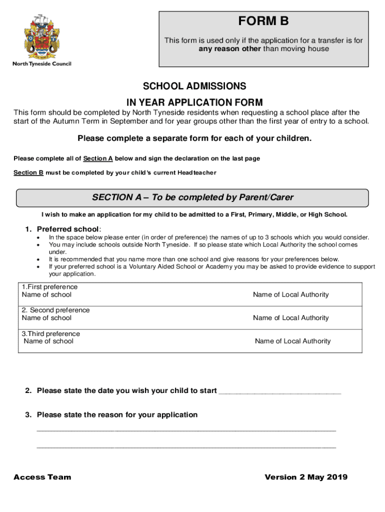 FORM B This form is used only if the application for a transfer is for any reason other than moving homeschool ADMISSIONS IN YEAR APPLICATION From This form should be completed by North Inside residents