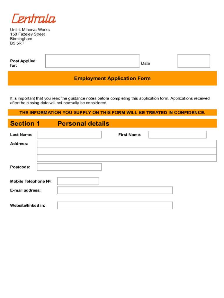 Unit 4 Minerva Works 158 Pamela Street Birmingham B5 5RTPost Applied for:Reemployment Application Format is important that you read the guidance notes before completing this application form. Applications