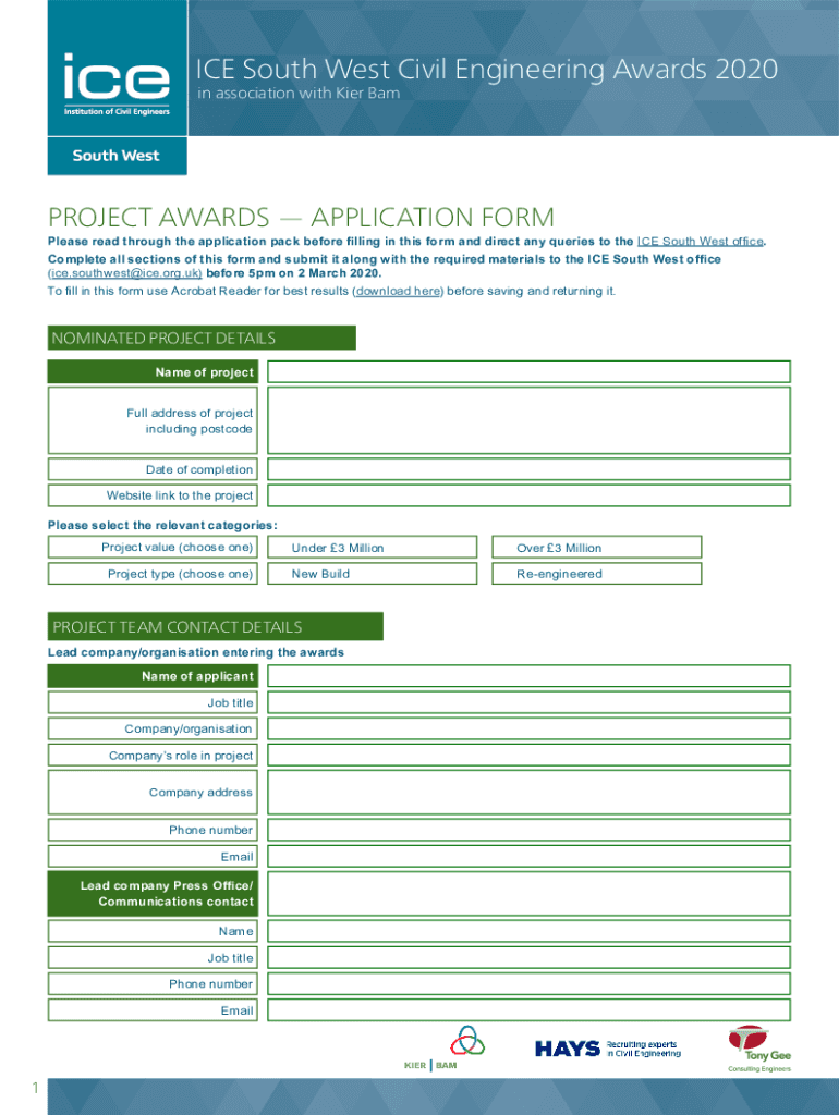 ICE South West Civil Engineering Awards 2020 Awards in association 2019 with Year Civil Engineering Awards, PROJECT APPLICATION FORM in associationAWARDS with Year InfrastructurePlease read through