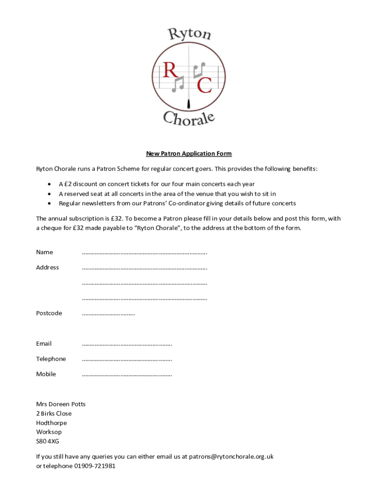 New Patron Application Form Ry ton Chorale runs a Patron Scheme for regular concert goers. This provides the following benefits: A 2 discount on concert tickets for our four main concerts each year