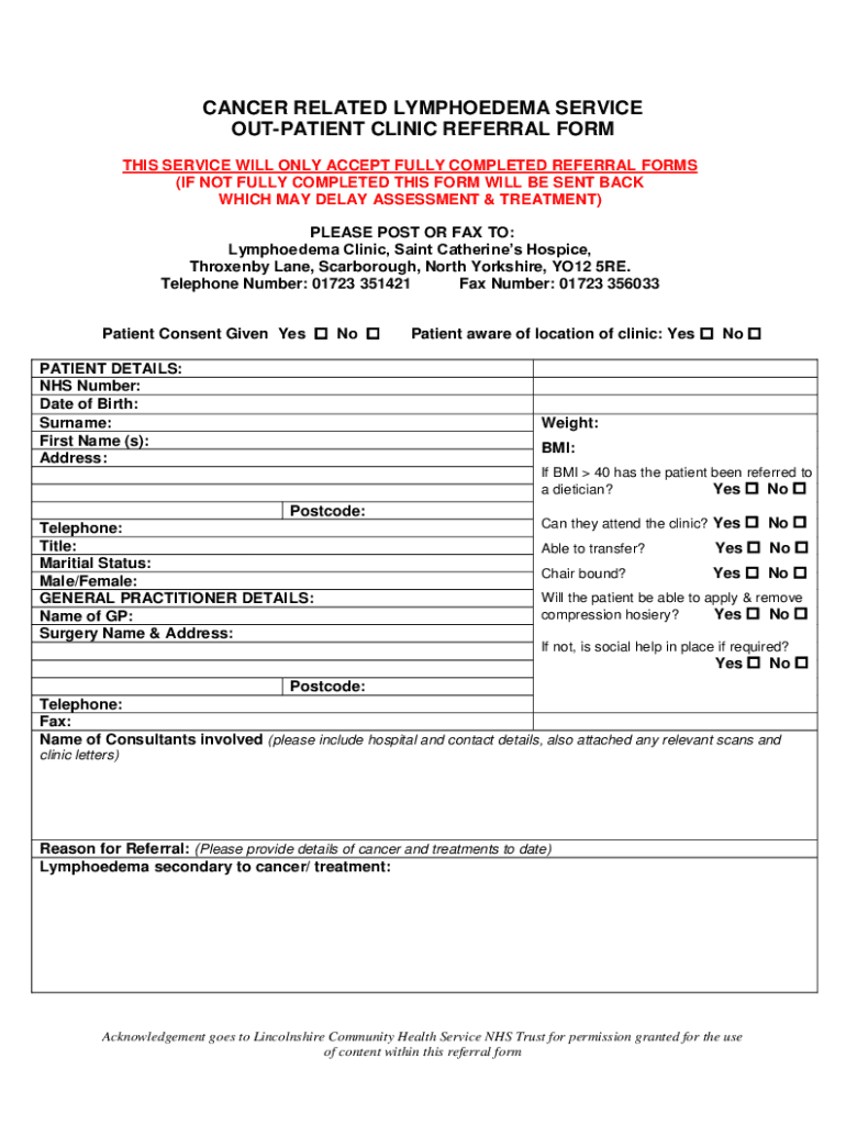 CANCER RELATED LYMPHEDEMA SERVICE OUTPATIENT CLINIC REFERRAL FORM THIS SERVICE WILL ONLY ACCEPT FULLY COMPLETED REFERRAL FORMS (IF NOT FULLY COMPLETED THIS FORM WILL BE SENT BACK WHICH MAY DELAY ASSESSMENT