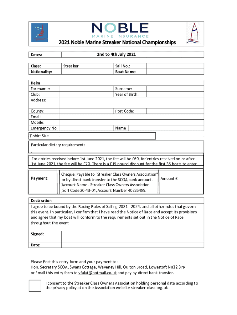 2021 Noble Marine Streaker National Championships 2nd to 4th July 2021Dates: Class: Nationality:StreakerHelm Forename: Club: Address:Sail No.: Boat Name:Surname: Year of Birth:County: Email: Mobile: