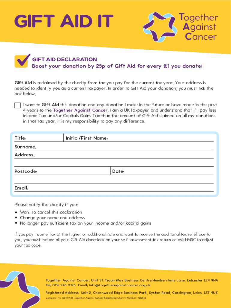 GIFT aid Together Against CancerGift aid declaration Boost your donation by 25p of Gift Aid for every 1 you donate! Gift Aid is reclaimed by the charity from tax you pay for the current tax year.