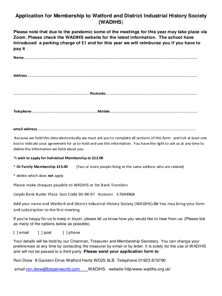 Application for Membership to Watford and District Industrial History Society (WADIS) Please note that due to the pandemic some meetings for this year may take place via Zoom. Please check the WADIS
