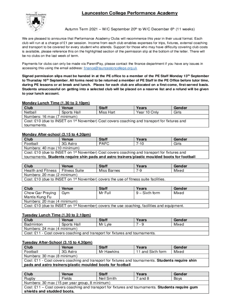 Launceston College Performance Academy Autumn Term 2021 W/C September 20th to W/C December 6th (11 weeks) We are pleased to announce that Performance Academy Clubs will recommence this year in their