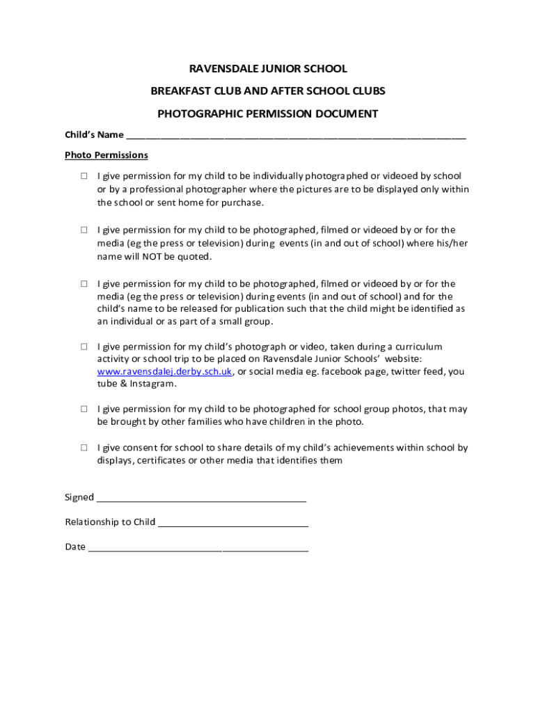 AVONDALE JUNIOR SCHOOL BREAKFAST CLUB AND AFTER SCHOOL CLUBS PHOTOGRAPHIC PERMISSION DOCUMENT Child's Name Photo Permissions I give permission for my child to be individually photographed or videoed