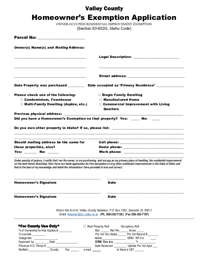 Valley CountyHomeowners Exemption Application OWNEROCCUPIED RESIDENTIAL IMPROVEMENT EXEMPTION(Section 63602G, Idaho Code) Parcel No: Owner(s) Name(s) and Mailing Address: Legal Description: Street