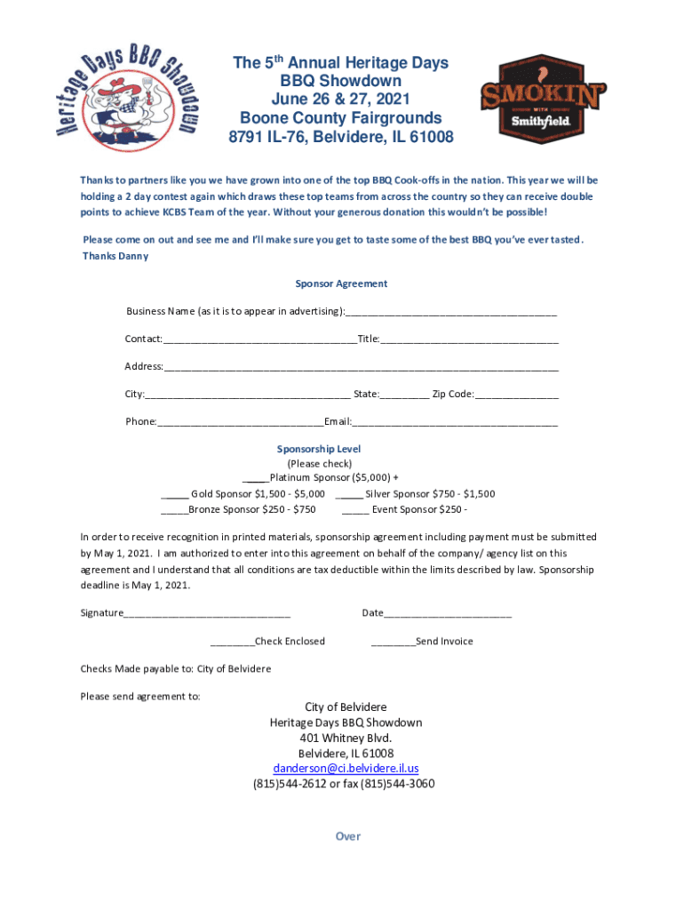 The 5th Annual Heritage Days BBQ Showdown June 26 & 27, 2021 Boone County Fairgrounds 8791 IL76, Belvedere, IL 61008 Thanks to partners like you, we have grown into one of the top BBQ Cook offs in