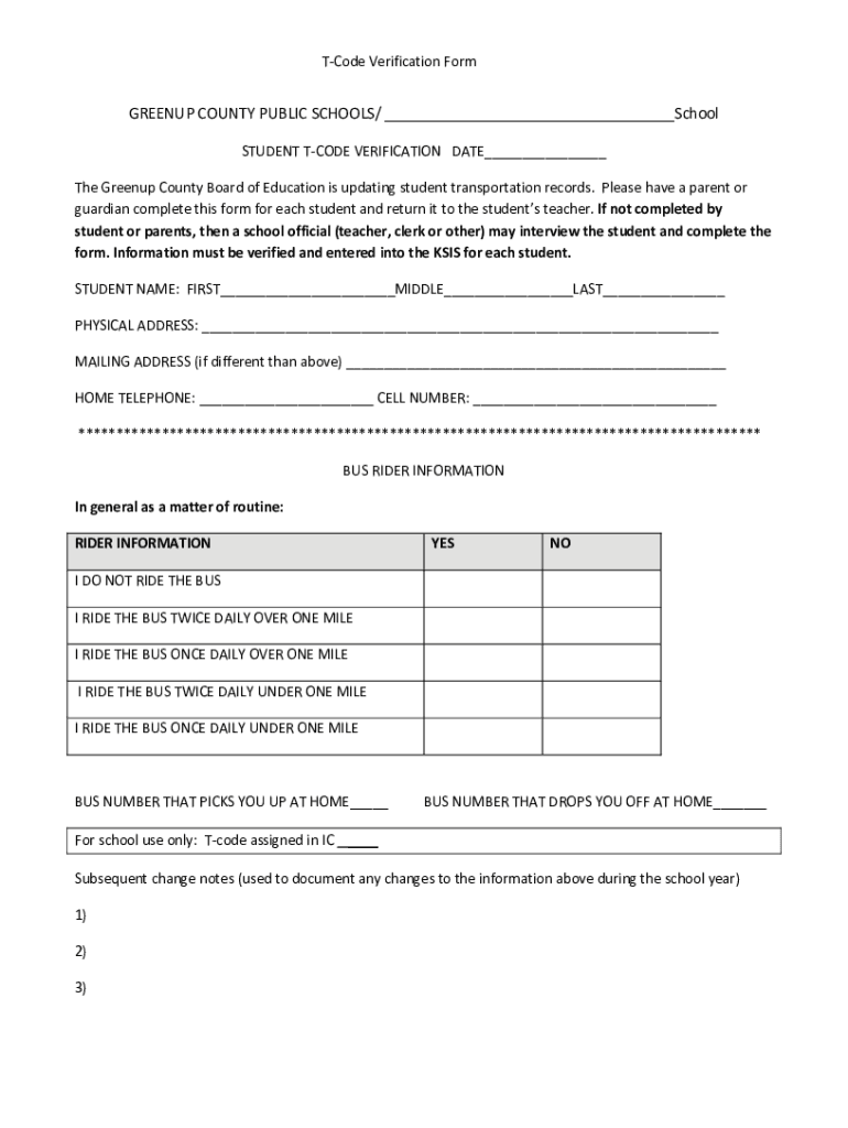 The T-Code Verification Form is intended for parents or guardians of students enrolled in Greenup County Public Schools who need to update transportation details.