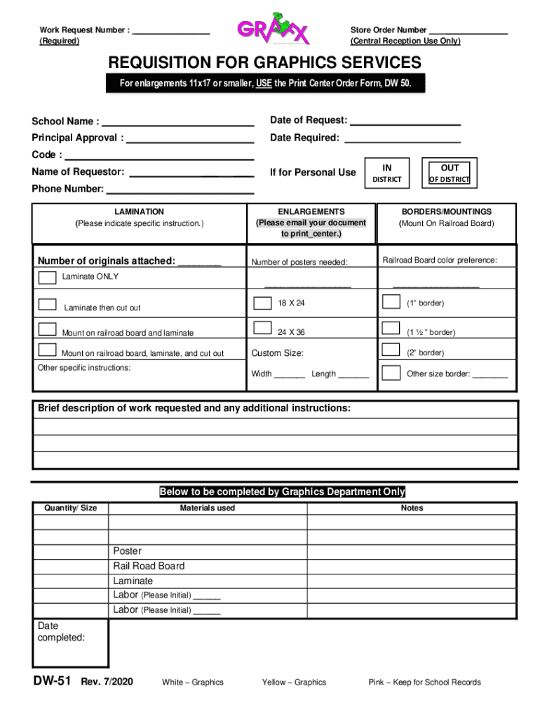 Work Request Number : (Required)Store Order Number (Central Reception Use Only)REQUISITION FOR GRAPHICS SERVICES For enlargements 11 17 or smaller, USE the Print Center Order Form, DW50. School Name