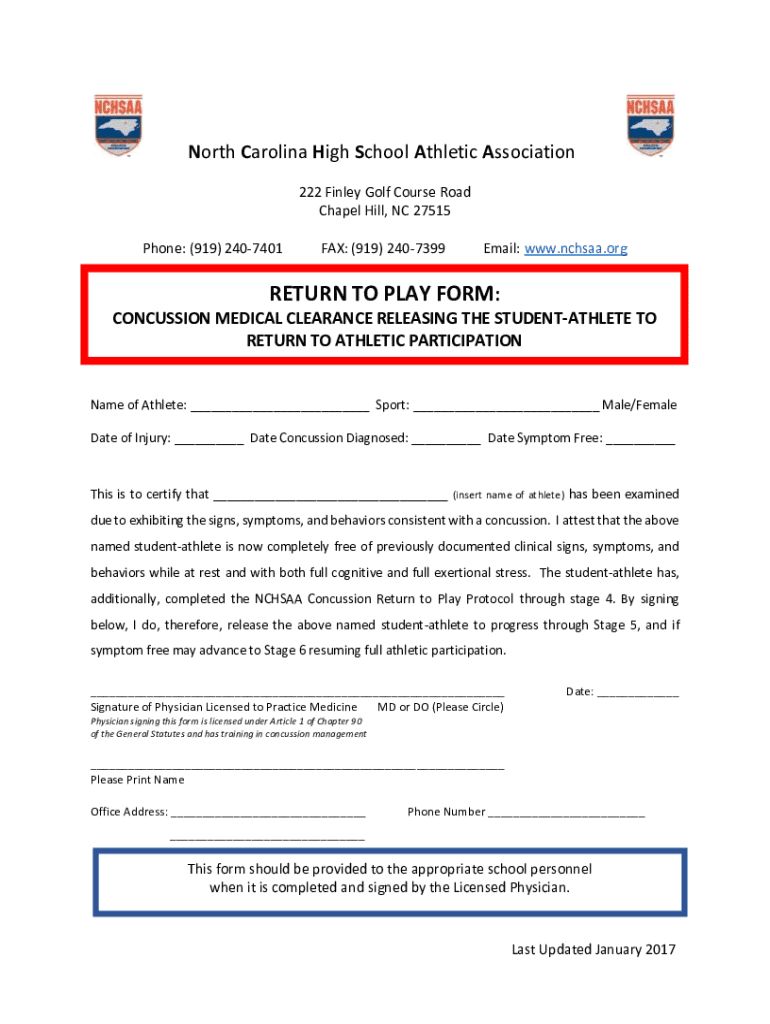North Carolina High School Athletic Association 222 Finley Golf Course Road Chapel Hill, NC 27515 Phone: (919) 2407401FAX: (919) 2407399Email: www.nchsaa.orgRETURN TO PLAY FORM: CONCUSSION MEDICAL