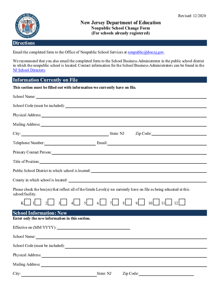 Revised: 12/2020New Jersey Department of Education Nonpublic School Change Form (For schools already registered)Directions Email the completed form to the Office of Nonpublic School Services at nonpublic@doe.nj.gov.