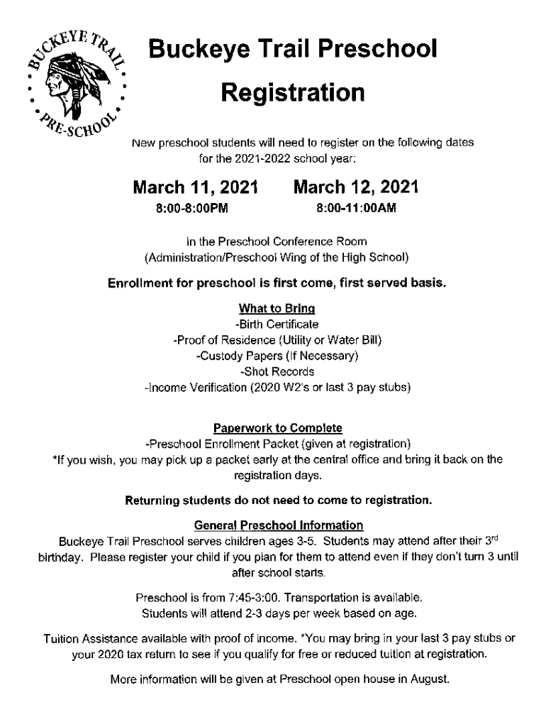 Buckeye Trail Preschool Registration New preschool students will need to register on the following dates for the 20212022 school year:March 11, 2021 8:008:00PMMarch 12, 2021 8:0011:00AMIn the Preschool