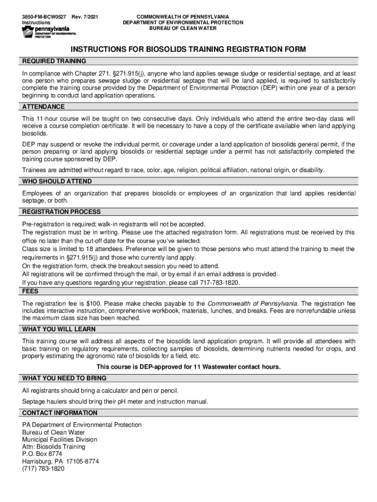 3850FMBCW0527 Instructions Rev. 7/2021COMMONWEALTH OF PENNSYLVANIA DEPARTMENT OF ENVIRONMENTAL PROTECTION BUREAU OF CLEAN WATERINSTRUCTIONS FOR SOLIDS TRAINING REGISTRATION FORM REQUIRED TRAINING