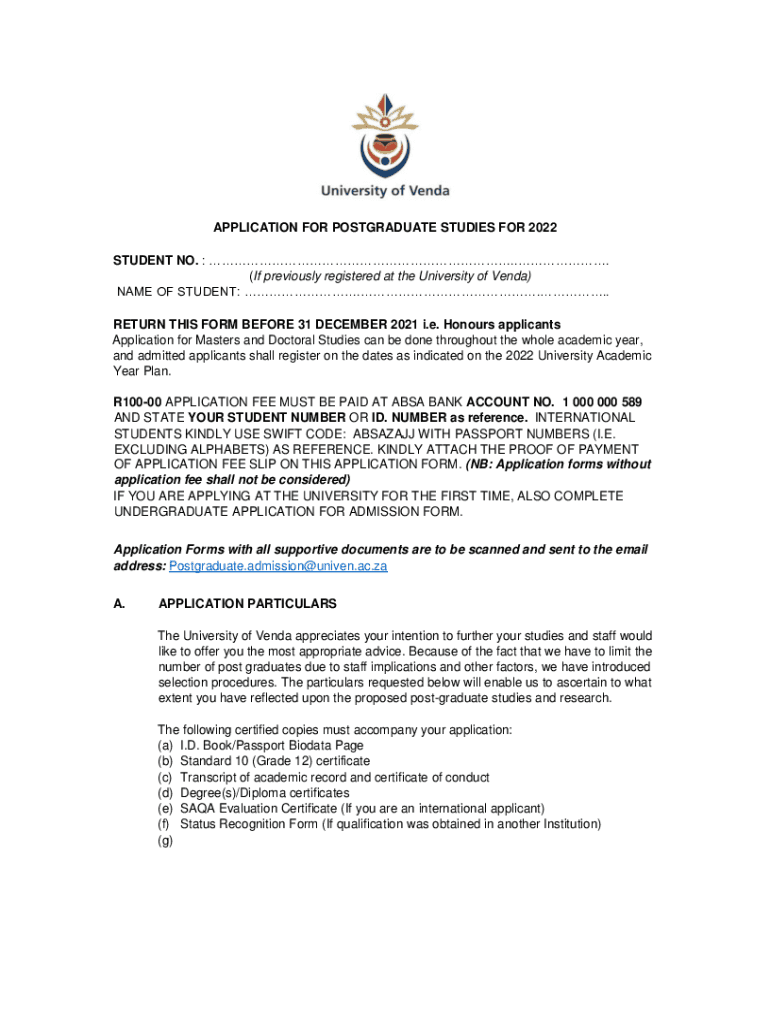 APPLICATION FOR POSTGRADUATE STUDIES FOR 2022 STUDENT NO. ... (If previously registered at the University of Veda) NAME OF STUDENT: .... RETURN THIS FORM BEFORE 31 DECEMBER 2021 i.e. Honors applicants