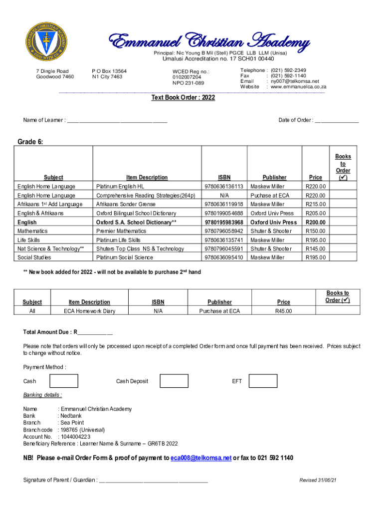 Emmanuel Christian Academy Principal: NIC Young B Mil (Still) PGCE LLB ELM (UNIMA)Males Accreditation no. 17 SCH01 00440 7 Dingle Road Good wood 7460P O Box 13564 N1 City 7463Telephone : Fax : Email