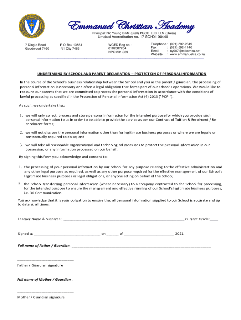 Emmanuel Christian Academy Principal: NIC Young B Mil (Still) PGCE LLB ELM (UNIMA)Males Accreditation no. 17 SCH01 00440 7 Dingle Road Good wood 7460P O Box 13564 N1 City 7463WCED Reg no.: 0102007204