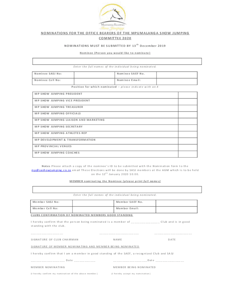 Get the free NOMINATIONS FOR THE OFFICE BEARERS OF THE MPUMALANGA SHOW ... - sashowjumping co