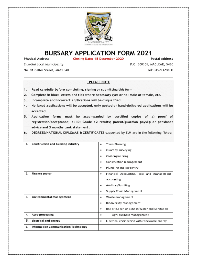 BURSARY APPLICATION FORM 2021 Physical AddressClosing Date: 15 December 2020Elundini Local MunicipalityPostal Address P.O. BOX 01, MacLean, 5480No. 01 Seller Street, Mackerel: 0459328100 PLEASE NOTE1.