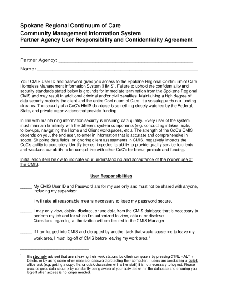 Spokane Regional Continuum of Care Community Management Information System Partner Agency User Responsibility and Confidentiality AgreementPartner Agency: Name: Your CMOS User ID and password gives