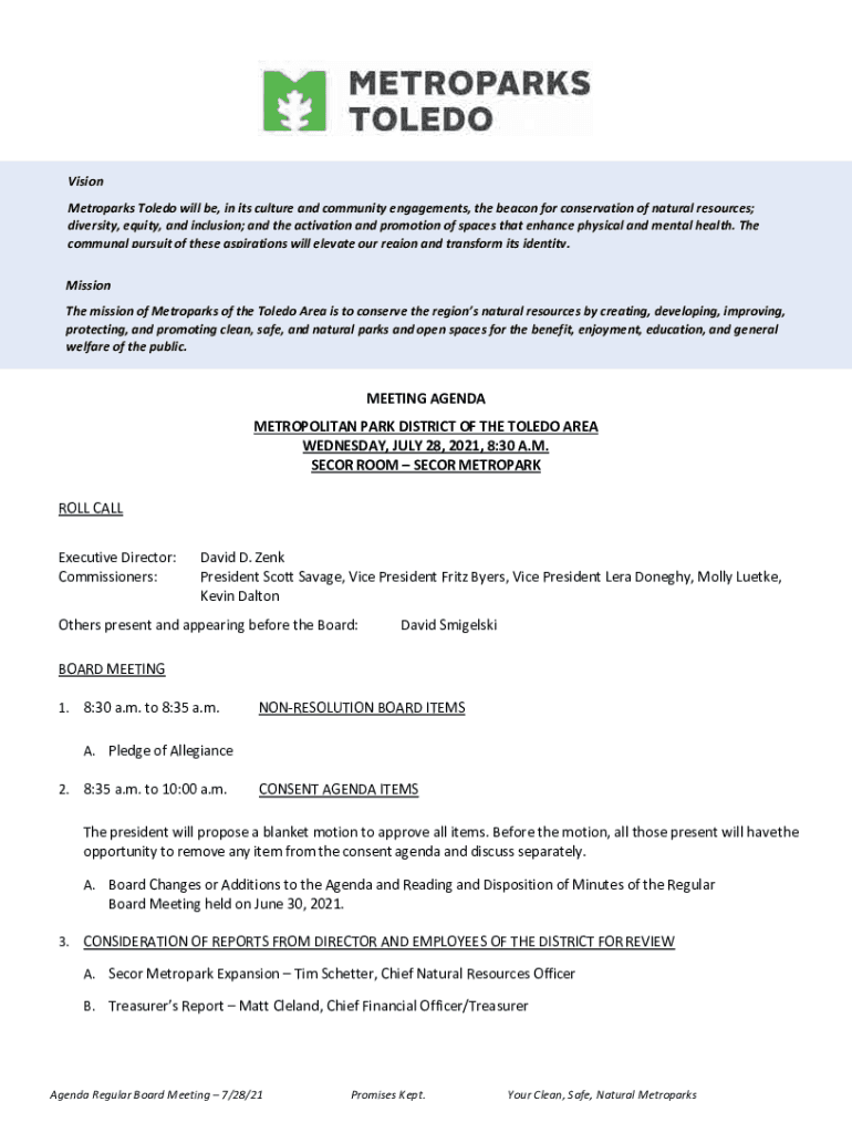 Vision MetroparksToledowillbe, initscultureandcommunityengagements, thebeaconforconservationofnaturalresources; diversity, equity, and inclusion;andtheactivationandpromotionofspacesthatenhancephysicalandmentalhealth.