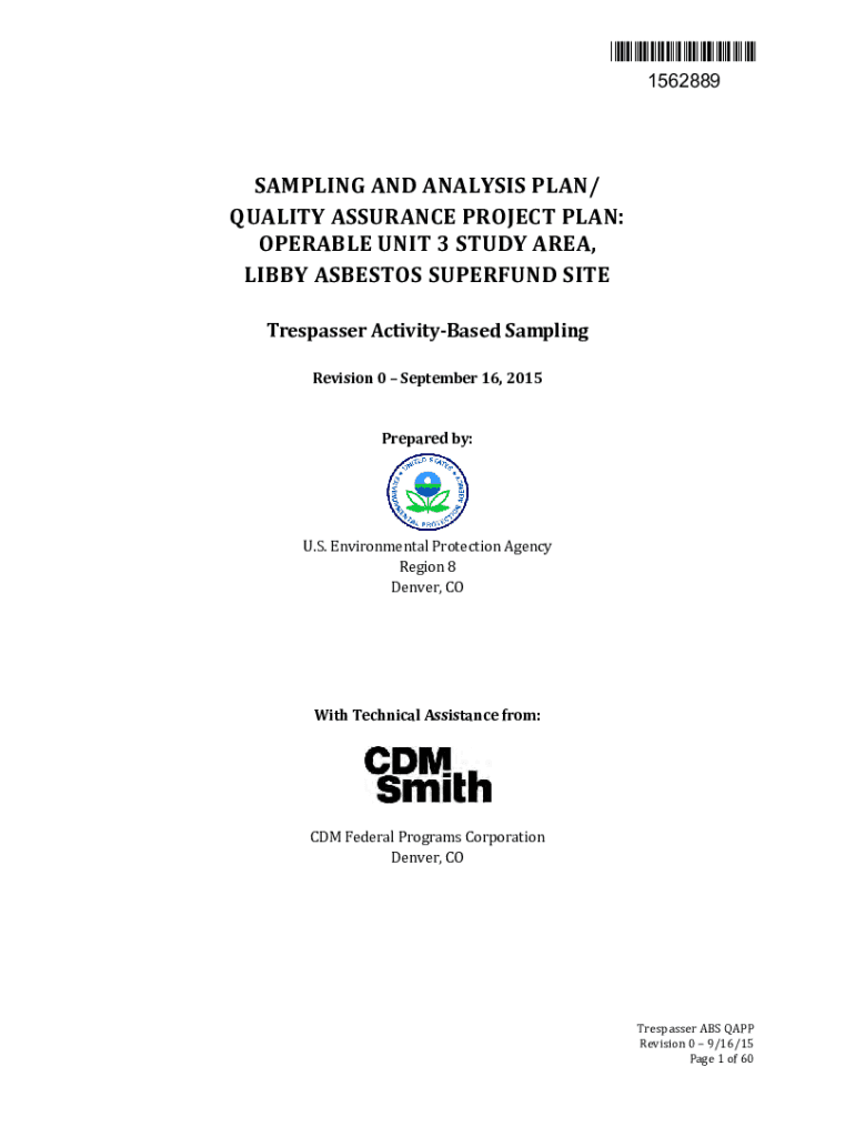 *1562889* 1562889SAMPLING AND ANALYSIS PLAN/ QUALITY ASSURANCE PROJECT PLAN: OPERABLE UNIT 3 STUDY AREA, LIBBY ASBESTOS SUPERFUND SITE Trespasser ActivityBased Sampling Revision 0 September 16, 2015,