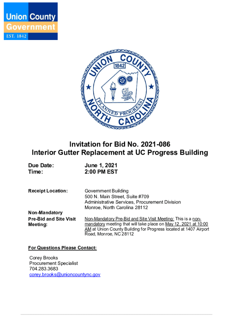 Invitation for Bid No. 2021086 Interior Gutter Replacement at UC Progress Building Due Date: Time:June 1, 2021 2:00 PM Receipt Location:Government Building 500 N. Main Street, Suite #709 Administrative