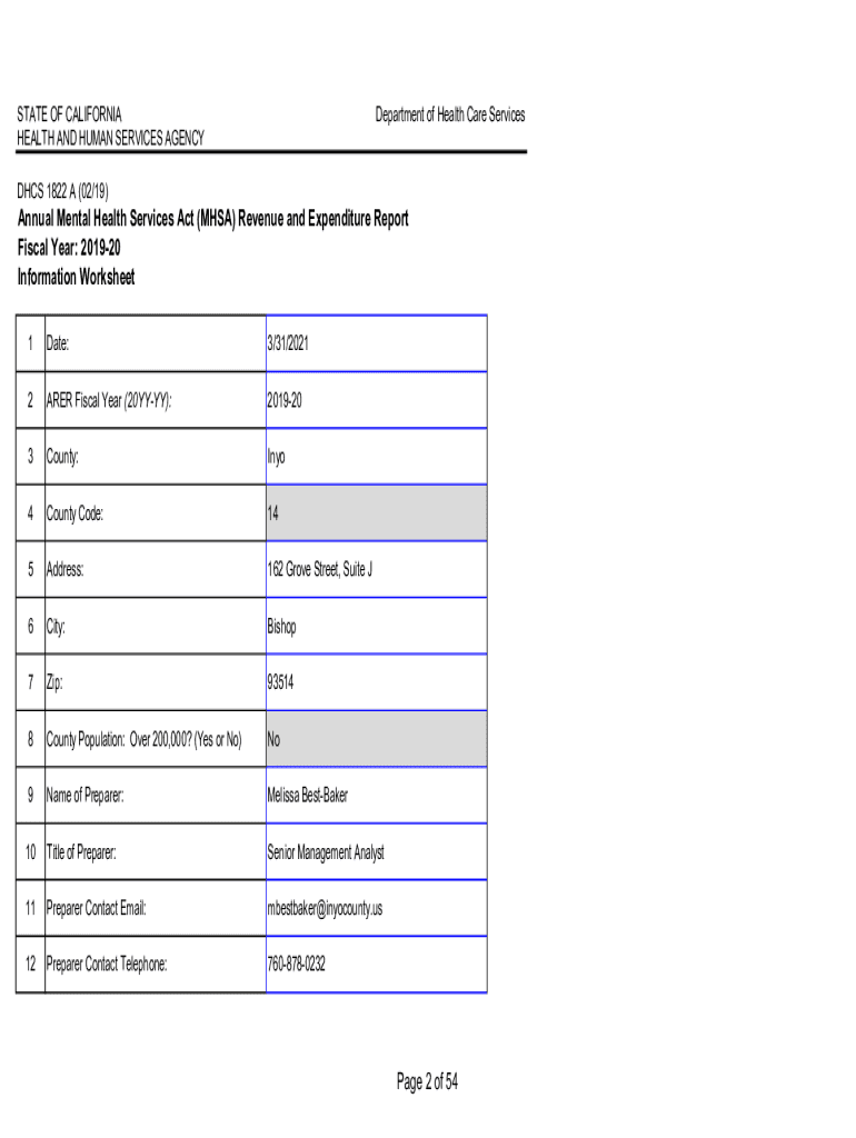 STATE OF CALIFORNIA HEALTH AND HUMAN SERVICES AGENCYDepartment of Health Care ServicesDHCS 1822 A (02/19)Annual Mental Health Services Act (MESA) Revenue and Expenditure Report Fiscal Year: 201920