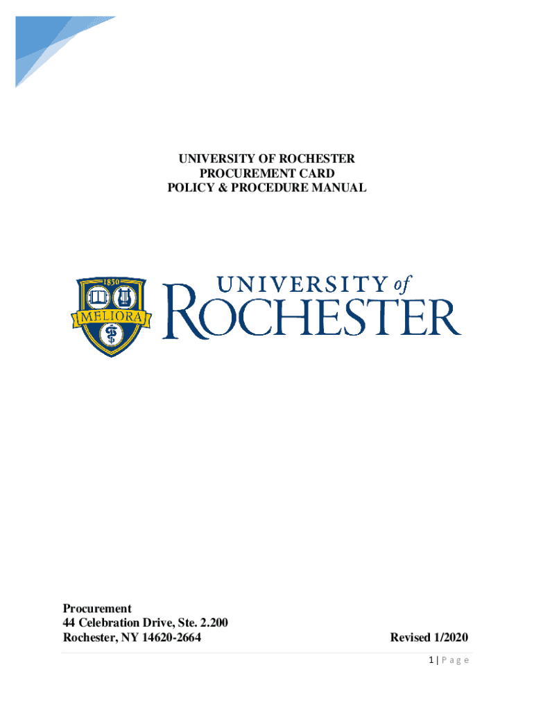 UNIVERSITY OF ROCHESTER PROCUREMENT CARD POLICY & PROCEDURE MANUALProcurement 44 Celebration Drive, Ste. 2,200 Rochester, NY 146202664Revised 1/2020 1 Preuniversity of Rochester Procurement Card Policy