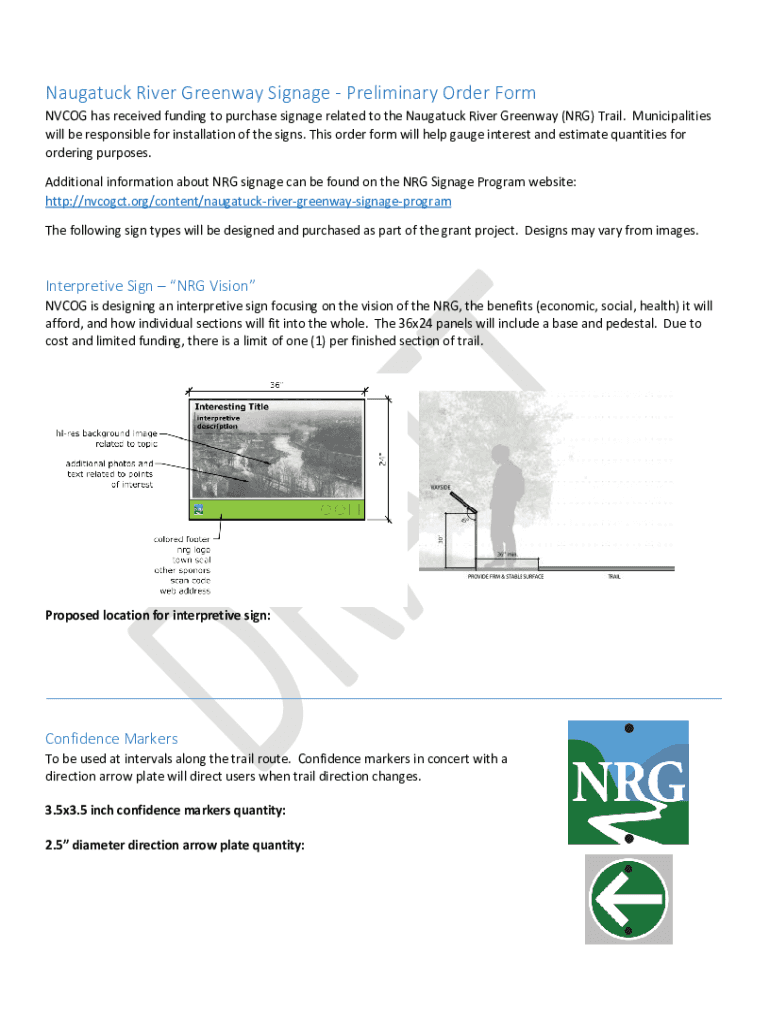 Naugatuck River Greenway Signage Preliminary Order Form NV COG has received funding to purchase signage related to the Naugatuck River Greenway (NRG) Trail. Municipalities will be responsible for