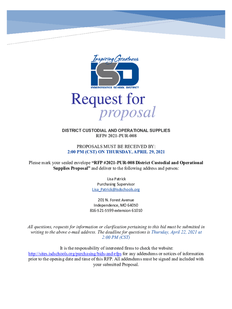 DISTRICT CUSTODIAL AND OPERATIONAL SUPPLIES RFP# 2021PUR008PROPOSALS MUST BE RECEIVED BY: 2:00 PM (CST) ON THURSDAY, APRIL 29, 2021, Please mark your sealed envelope RFP #2021PUR008 District Custodial