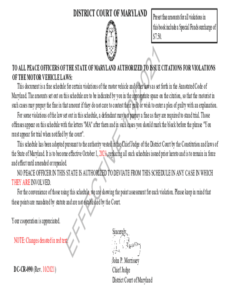 Preset fine amounts for all violations in this book include a Special Funds surcharge of $7.50.02 1DISTRICT COURT OF MARYLANDER FE CTI VE10 /2TO ALL PEACE OFFICERS OF THE STATE OF MARYLAND AUTHORIZED