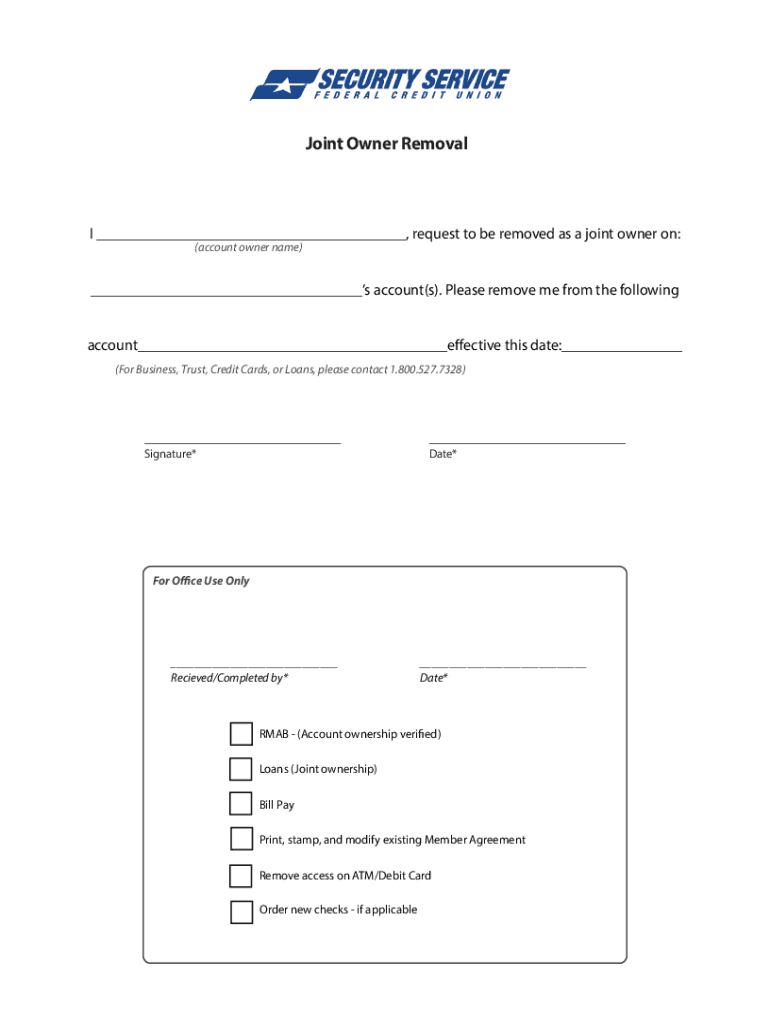 Joint Owner Removal, request to be removed as a joint owner on: (account owner name) s account(s). Please remove me from the following account effective this date: (For Business, Trust, Credit Cards,