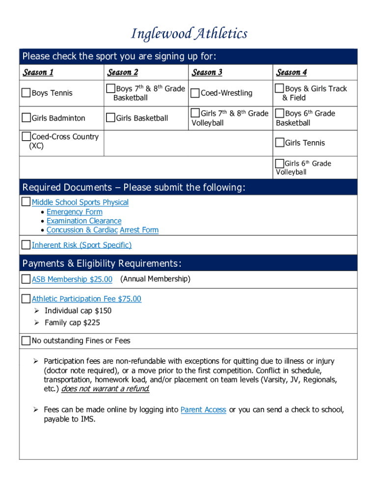 Inglewood Athletics Please check the sport you are signing up for: Season 1Season 2Season 3 Boys Tennis Boys 7th & 8th Grade CoedWrestling Basketball Girls Badminton Girls Basketball Girls 7th & 8th
