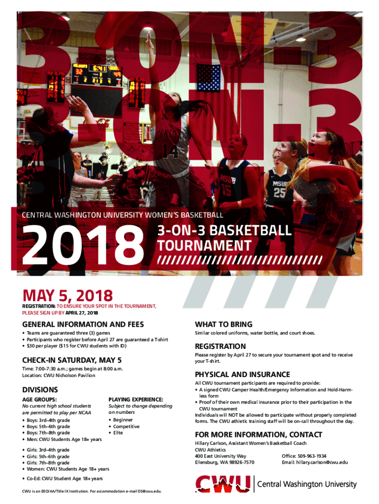 2018////CENTRAL WASHINGTON UNIVERSITY WOMEN BASKETBALL3ON3 BASKETBALL TOURNAMENT/////////////////////////////////////MAY 5, 2018REGISTRATION: TO ENSURE YOUR SPOT IN THE TOURNAMENT, PLEASE SIGN UP