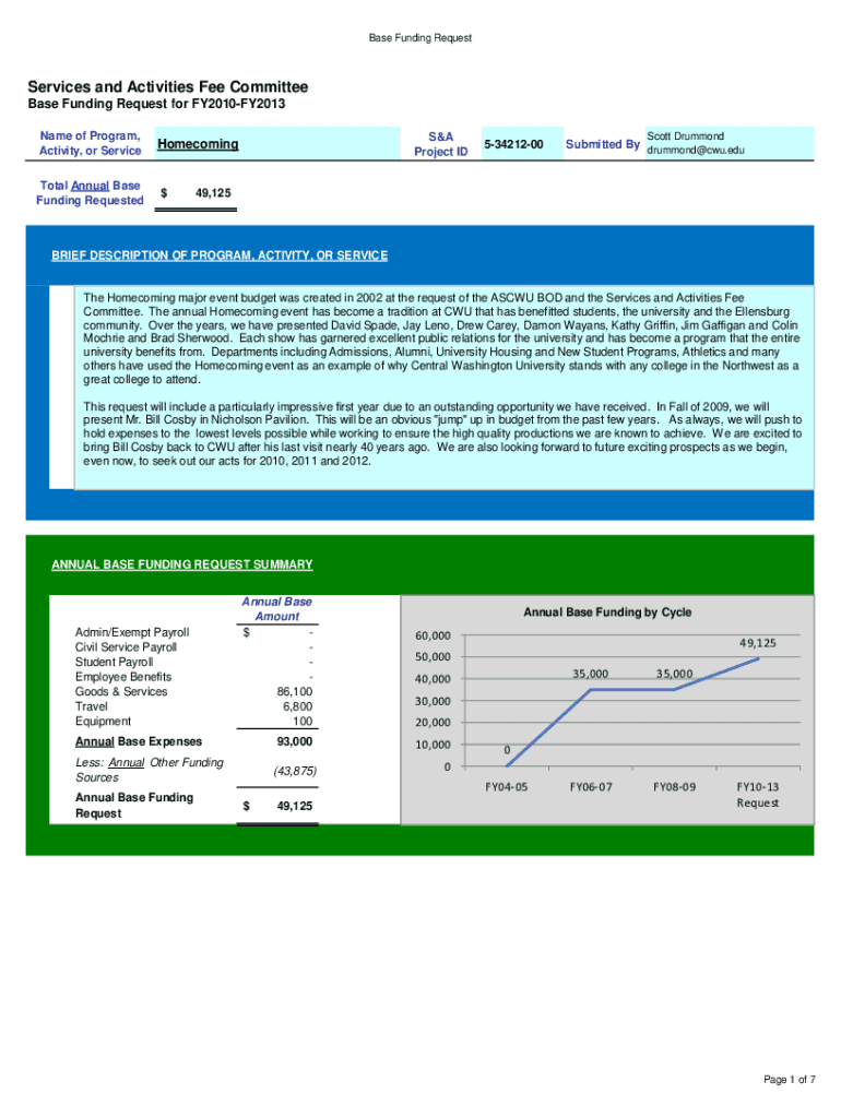 Base Funding RequestServices and Activities Fee Committee Base Funding Request for FY2010FY2013 Name of Program, Activity, or Service Total Annual Base Funding Requested Project IDHomecoming$53421200Scott