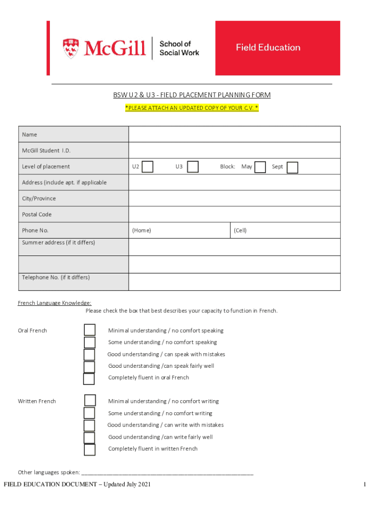 BSW U2 & U3 FIELD PLACEMENT PLANNING FORM *PLEASE ATTACH AN UPDATED COPY OF YOUR C.V. *Name McGill Student I.D. Level of placementU2U3Block: MaySeptAddress (include apt. If applicable City/Province