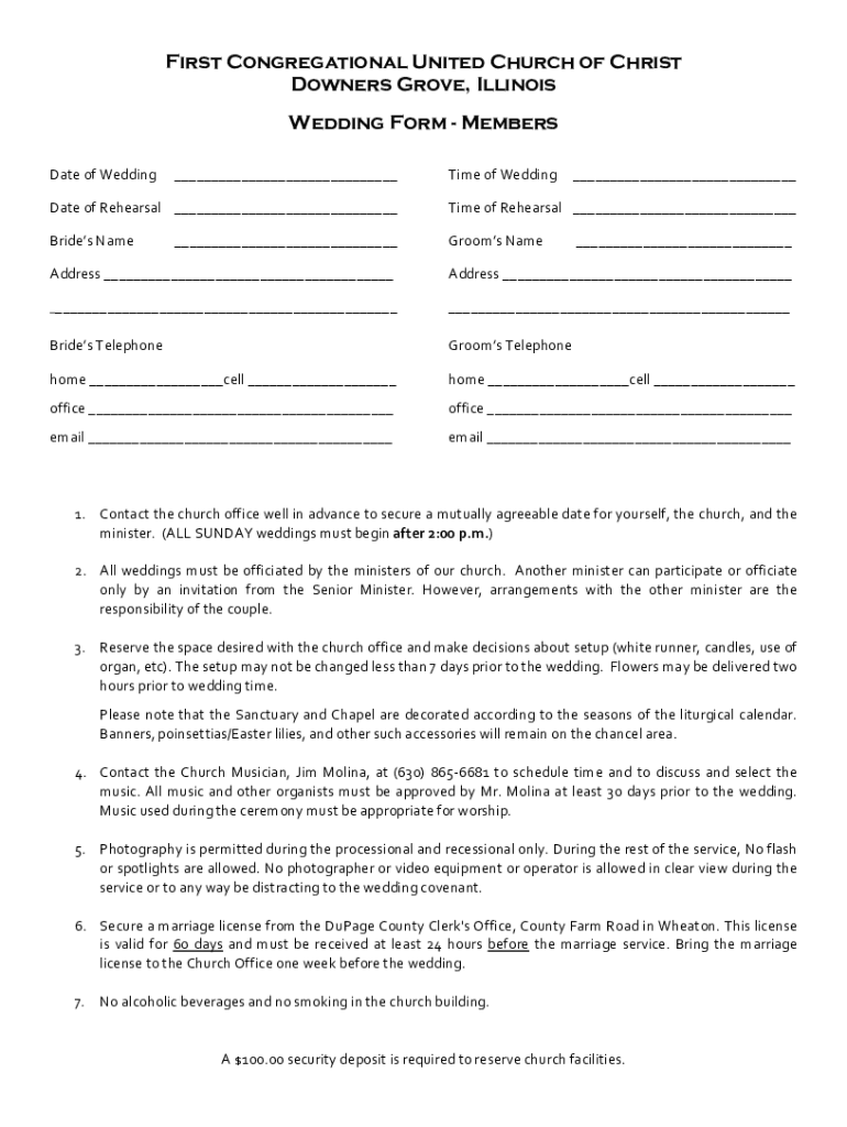 First Congregational United Church of Christ Downers Grove, Illinois Wedding Form Members DateofWedding TimeofWedding DateofRehearsal TimeofRehearsal Bridesmaid Groomsman Address BridesTelephone GroomsTelephonehome
