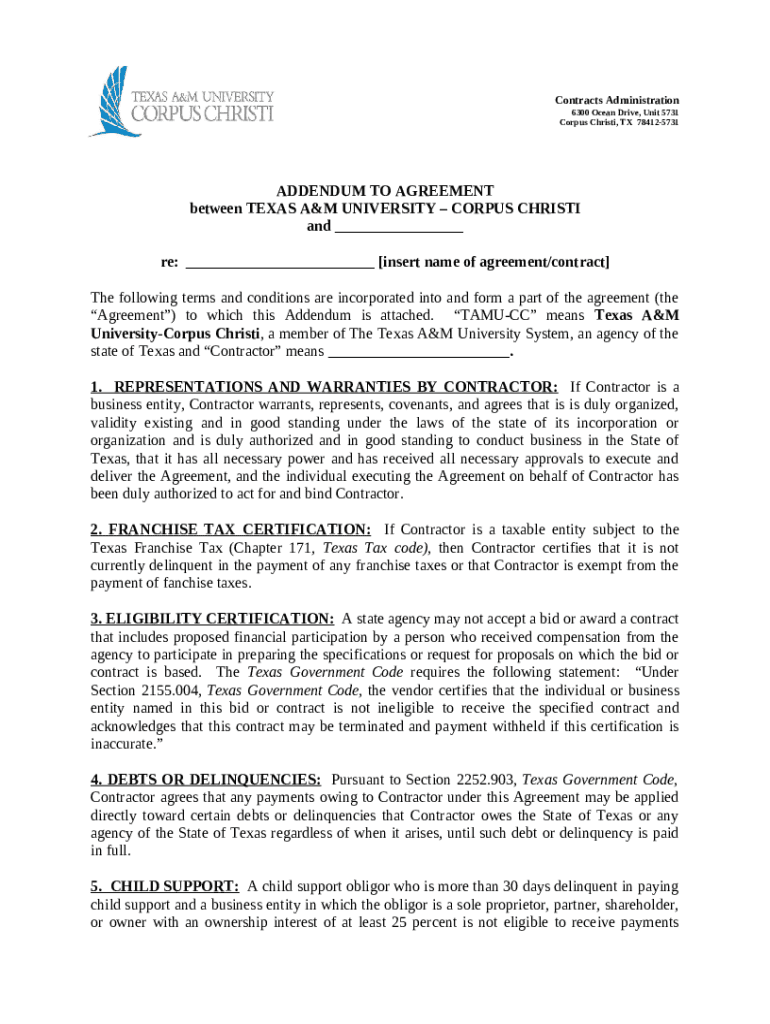 Frequently asked questions about the form TAMU-CC Addendum short version. Addendum to vendor's contract/agreement