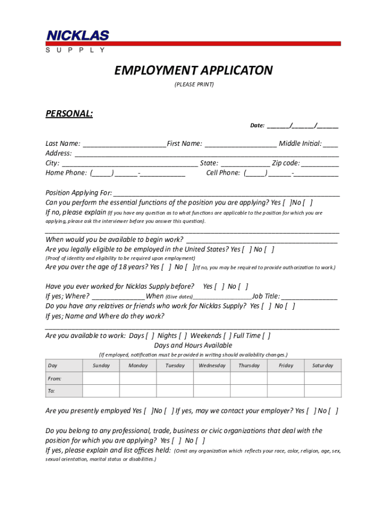 Get the free nicklas-supply-employment-application