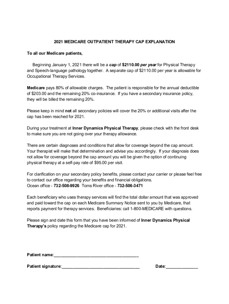 2021 MEDICARE OUTPATIENT THERAPY CAP EXPLANATION To all our Medicare patients, Beginning January 1, 2021, there will be a cap of $2110.00 per year for Physical Therapy and Speech language pathology