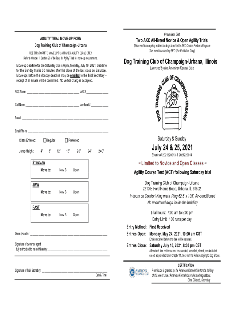 Premium Stability TRIAL MOVE UP FORM Dog Training Club of ChampaignUrbanaTwo AKC Allured Novice & Open Agility TrialsThis event is accepting entries for dogs listed in the AKC Canine Partners Program