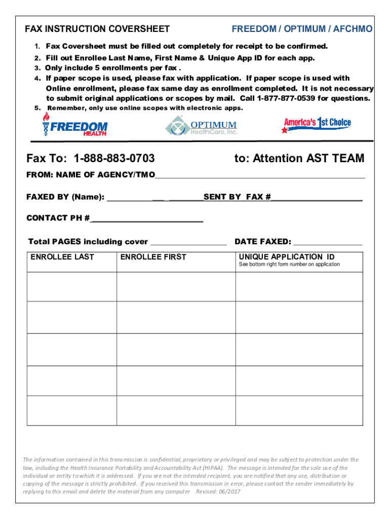 FAX INSTRUCTION COVERSHEETFREEDOM / OPTIMUM / AFCHMO1. Fax Cover sheet must be filled out completely for receipt to be confirmed. 2. Fill out Enrolled Last Name, First Name & Unique App ID for each
