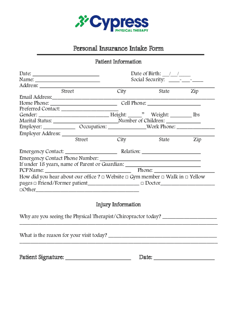 Get the free Personal Insurance Intake Form - cypress-pt.com